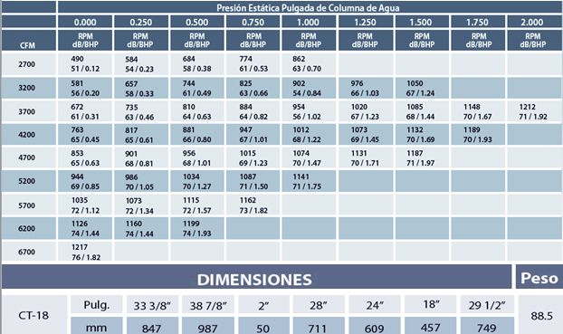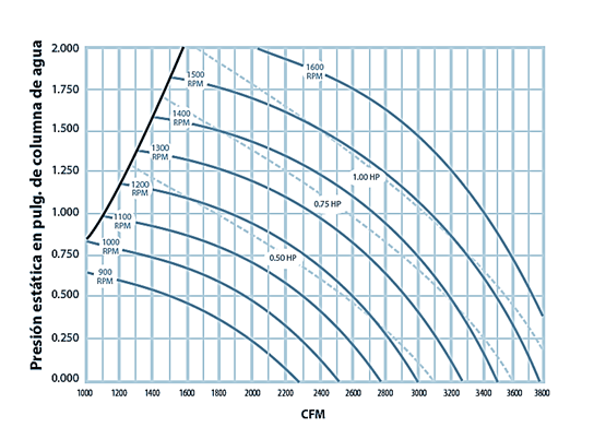 Una vez seleccionado el flujo en CFM con la presión estática, se puede determinar la potencia del motor que requiere (BHP).