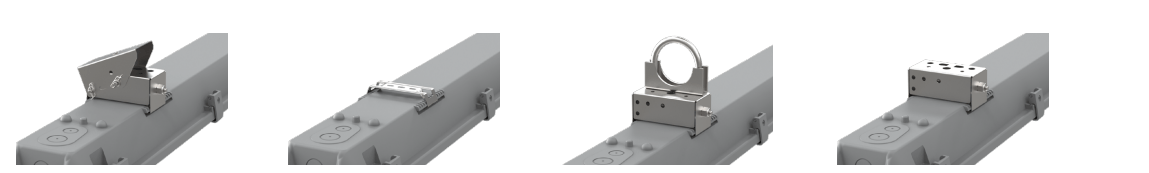 - Superficie (pared, techo) usando soportes estándar (acero inoxidable 301) incluye gancho para colgar cadena